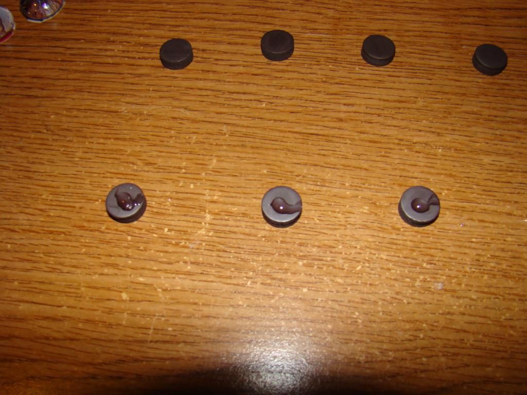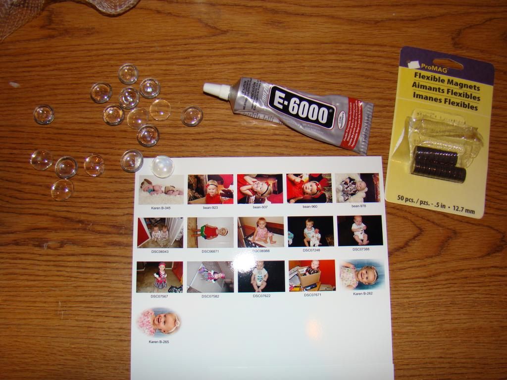 Once each marble is placed you don't need to wait for them to dry. Lay your magnets out and add a small dab of glue to the center of each one just like you did with the pictures.