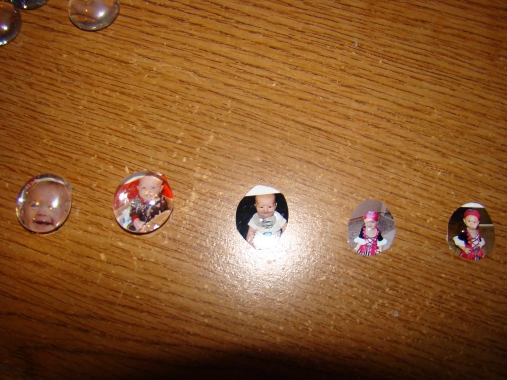Once you have them all cut out it's easiest to divide them into a couple of groups to glue. Add a small dab of glue to the center of each photo, then press a marble flat side down onto each picture. Press firmly until you see the glue spread underneath completely.