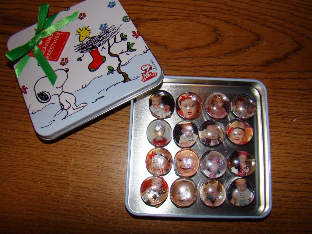 Take the marble/pictures and firmly press them on top of the magnet. Once that was complete I placed them all into the gift card tin to dry. It is best to let them dry and air out for a few days before you put the lid on the tin, because the glue can be strong smelling.
