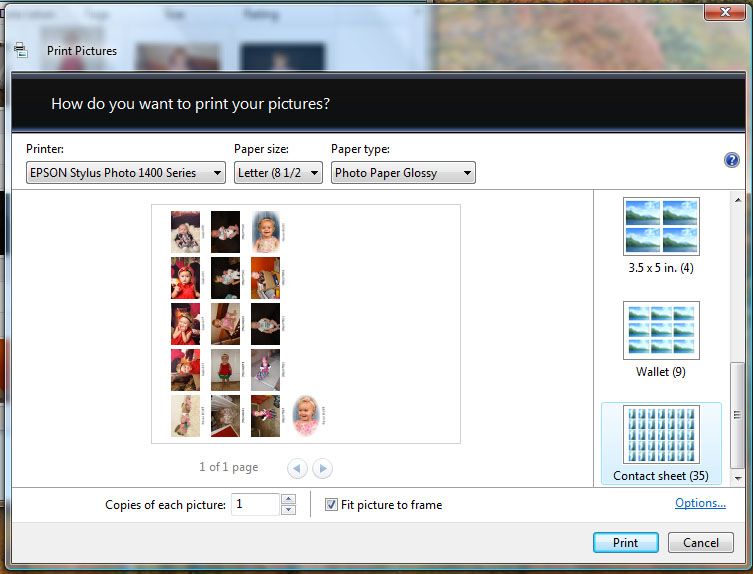 I picked out as many photos as I needed and added them all to a folder called 'Magnets'. I selected all of the pictures in the folder, right click, and print. When you get to the print screen make sure you have photo paper selected, and the size 8.5 by 11. You should be able to choose how big you want the photo to be, such as 8X10 or 5X7, you need to choose the option called 'Contact Sheet' which can print up to 35 very small pictures.